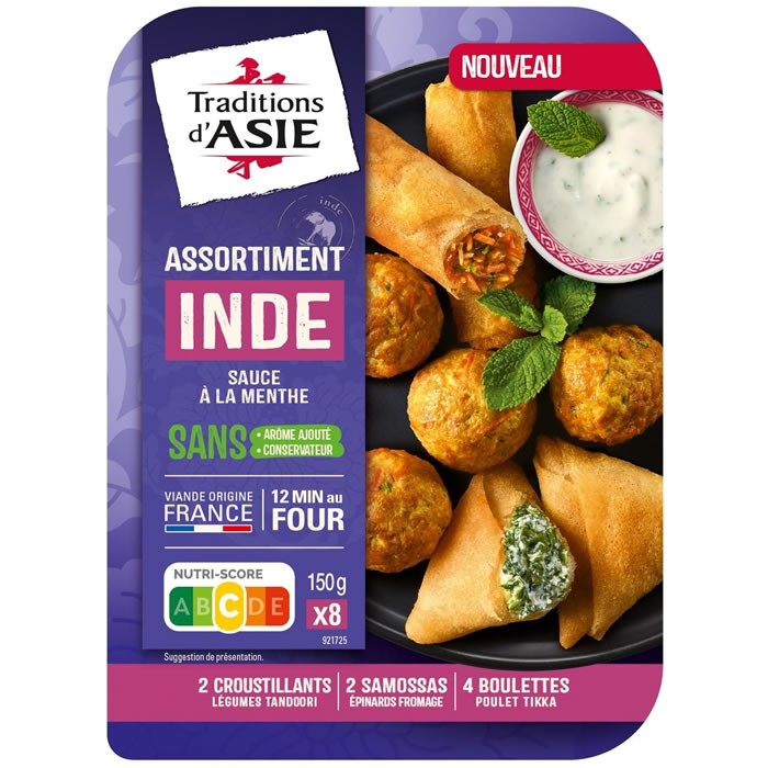 Assortiment de samossas, croustillant de légumes et boulette Traditions d’Asie. Spécialités indiennes, 8 pièces + sauce menthe, poulet français tikka, légumes tandoori, fromage épinards, 150g, Nutriscore C.