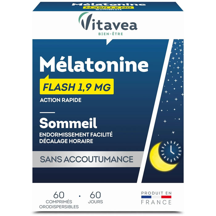 Améliorez la qualité de votre sommeil avec le complément alimentaire Mélatonine Flash 1,9 mg de VITAVEA. Cette formule est votre alliée pour un sommeil réparateur et pour atténuer les effets du décalage horaire. Hautement dosé, chaque comprimé orodispersible au goût menthe libère 1,9 mg de mélatonine pour favoriser un endormissement rapide.
