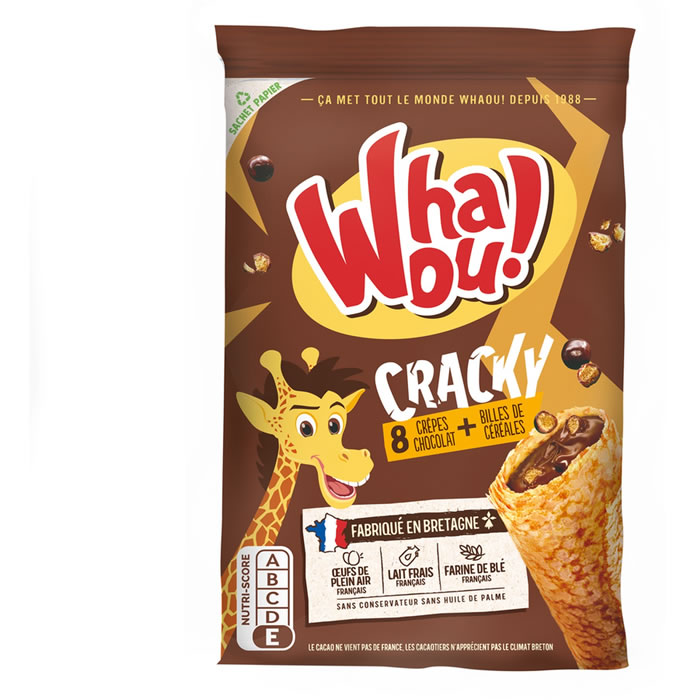 Crêpes fourrées au chocolat au lait et billes de céréales croustillantes, douceur et croquant. 8 pièces, 256g, WHAOU Cracky, France.