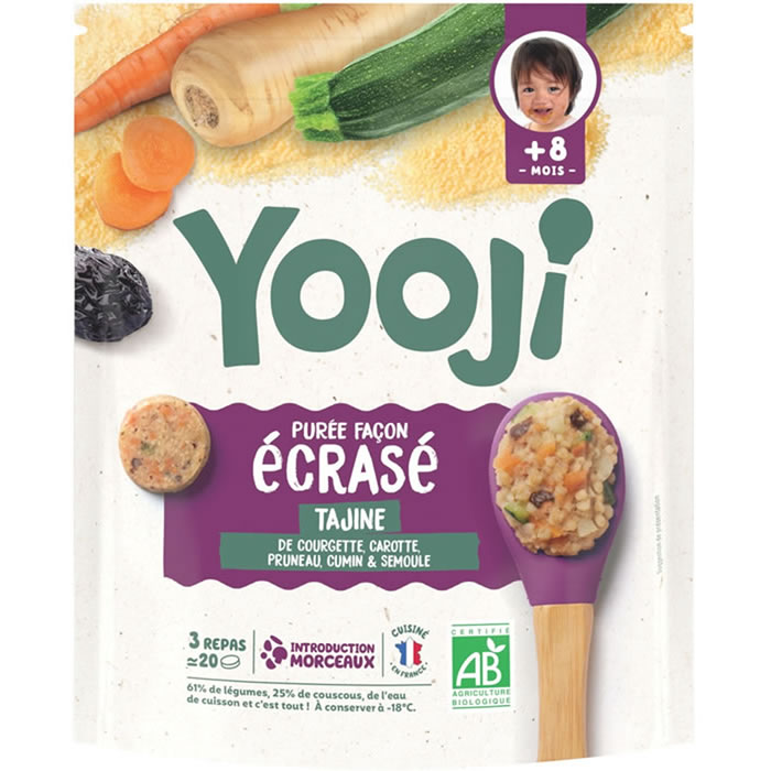 Purée façon écrasé tajine Yooji : texture écrasée, 2/3 légumes, 1/3 féculents, cuisson vapeur, portions surgelées, dès 8 mois. Agriculture biologique européenne.